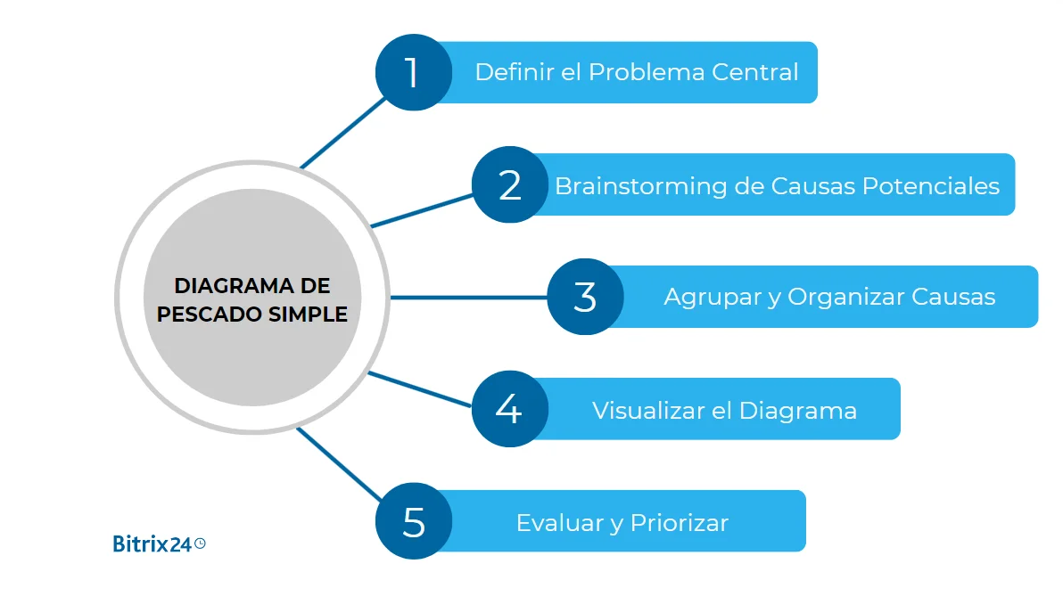 Prueba Bitrix24 GratisEl Diagrama de Ishikawa, también conocido como diagrama de pescado, es una herramienta de análisis utilizada para identificar las causas raíz de un problema. Su estructura se asemeja a un esqueleto de pescado, con la cabeza representando el problema y las espinas desglosando las posibles causas.