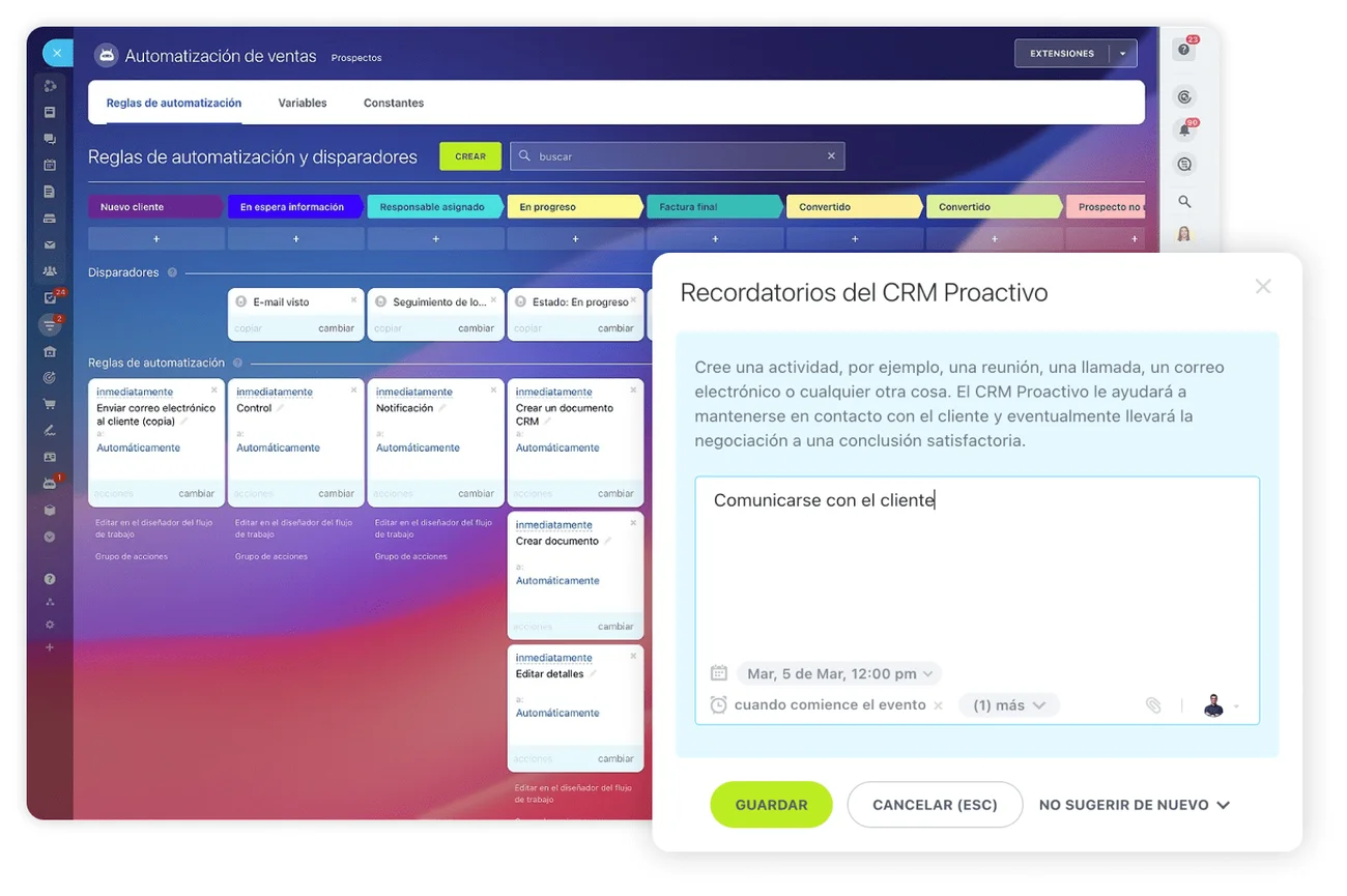 De esta forma, podrías conectar el CRM con el software de gestión de proyectos, la plataforma de marketing y las redes sociales, por ejemplo. Sería posible realizar el seguimiento de clientes potenciales, generar informes o actualizar bases de datos sin que tus empleados debieran ocuparse de ello. Una de las grandes ventajas de estas herramientas de optimización del flujo de trabajo es su capacidad para enviar notificaciones y recordatorios con el fin de que ningún cambio se pierda y todos los miembros del equipo puedan llevar a cabo su labor con la información actualizada.
