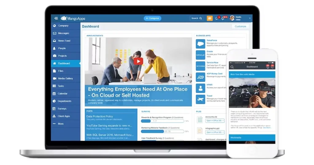 Entramos en el terreno de herramientas con integraciones potentes que centralizan todas las funcionalidades en un sólo lugar. MangoApps se presenta como una solución integral que unifica comunicación interna, gestión de tareas, colaboración y experiencia del empleado en una sola plataforma. Especialmente útil para medianas y grandes empresas con equipos distribuidos, permite centralizar archivos, automatizar flujos de trabajo y fomentar una cultura organizacional activa y participativa.