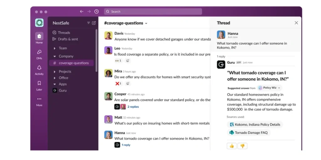 El último en la lista es Guru. Estaría mucho más alto en la lista de no ser por su enfoque hiperespecializado. Es una plataforma moderna que fusiona intranet, buscador empresarial y base de conocimiento colaborativa, todo impulsado por inteligencia artificial. Su objetivo es claro: que tu equipo tenga la información correcta, en el momento exacto y sin romper el ritmo de trabajo. ¿Cómo lo logra? Con integraciones fluidas (Slack, Teams, Chrome, Outlook, Zendesk) y una extensión de navegador que permite capturar y compartir conocimiento al instante.