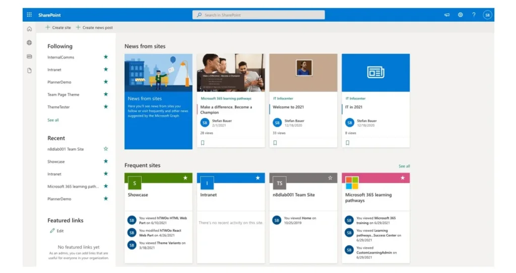 La opción del gigante tecnológico está siempre presente en cualquier listado. Microsoft SharePoint Online es una opción potente para quienes buscan una intranet integral que combine gestión documental, colaboración en equipo y flujos de trabajo personalizados. Ideal para organizaciones que exigen robustez y flexibilidad, permite crear sitios adaptados tanto para la colaboración diaria como para la difusión de información a gran escala. Su integración nativa con Microsoft Office 365 y un amplio ecosistema de aplicaciones de terceros facilitan la automatización de procesos y la centralización de documentos críticos, aumentando la eficiencia operativa.