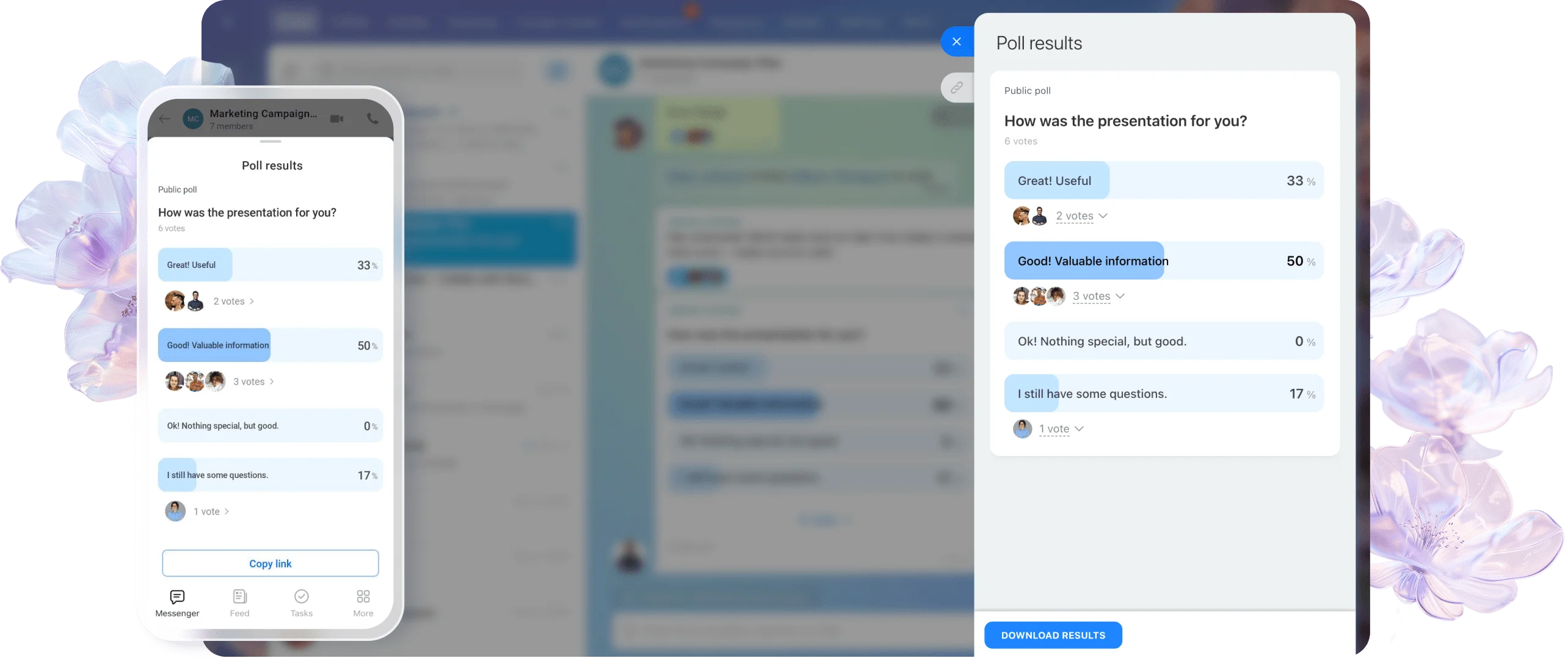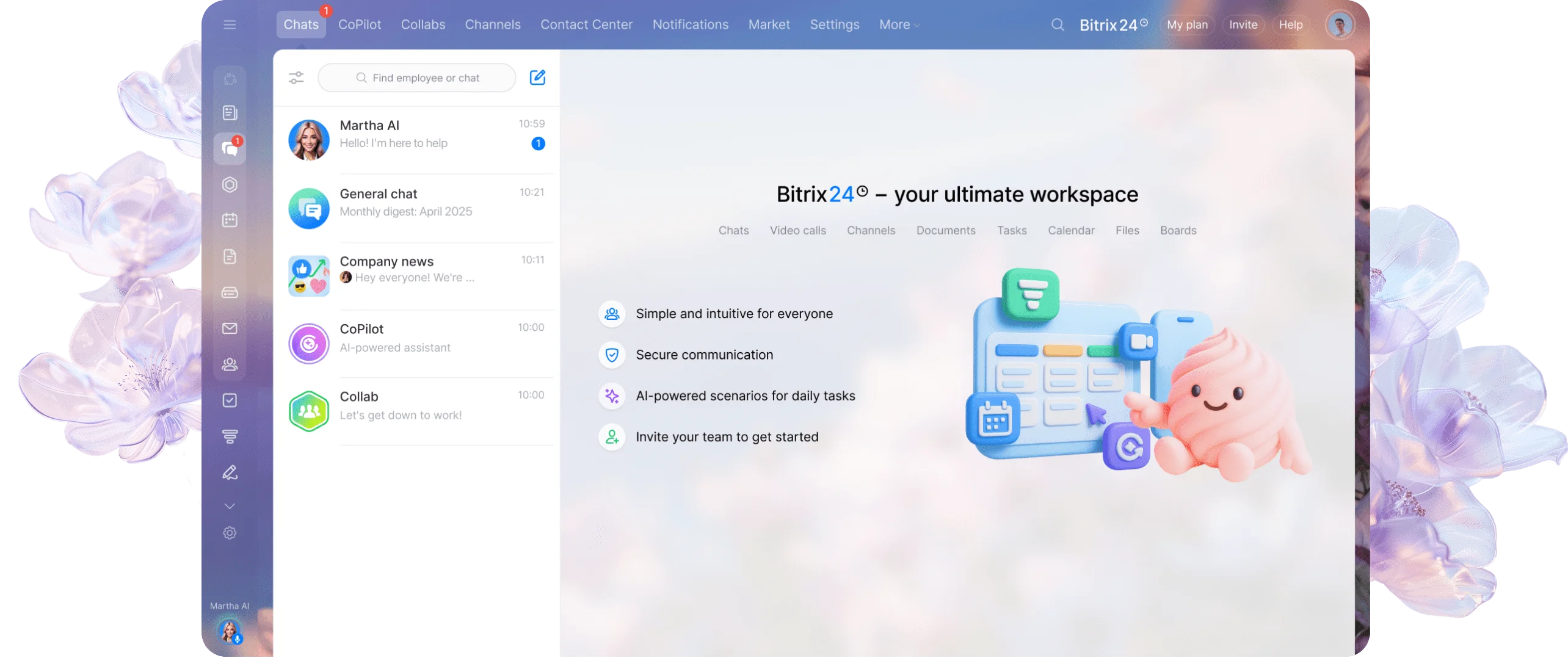 El nuevo Messenger no es solo una herramienta de chat: ahora es el centro de Bitrix24. Toda tu comunicación, notificaciones y coordinación de equipo florecen en un solo espacio seguro e inteligente. Crea encuestas, obtén retroalimentación instantánea, colabora en tiempo real y protege conversaciones confidenciales.