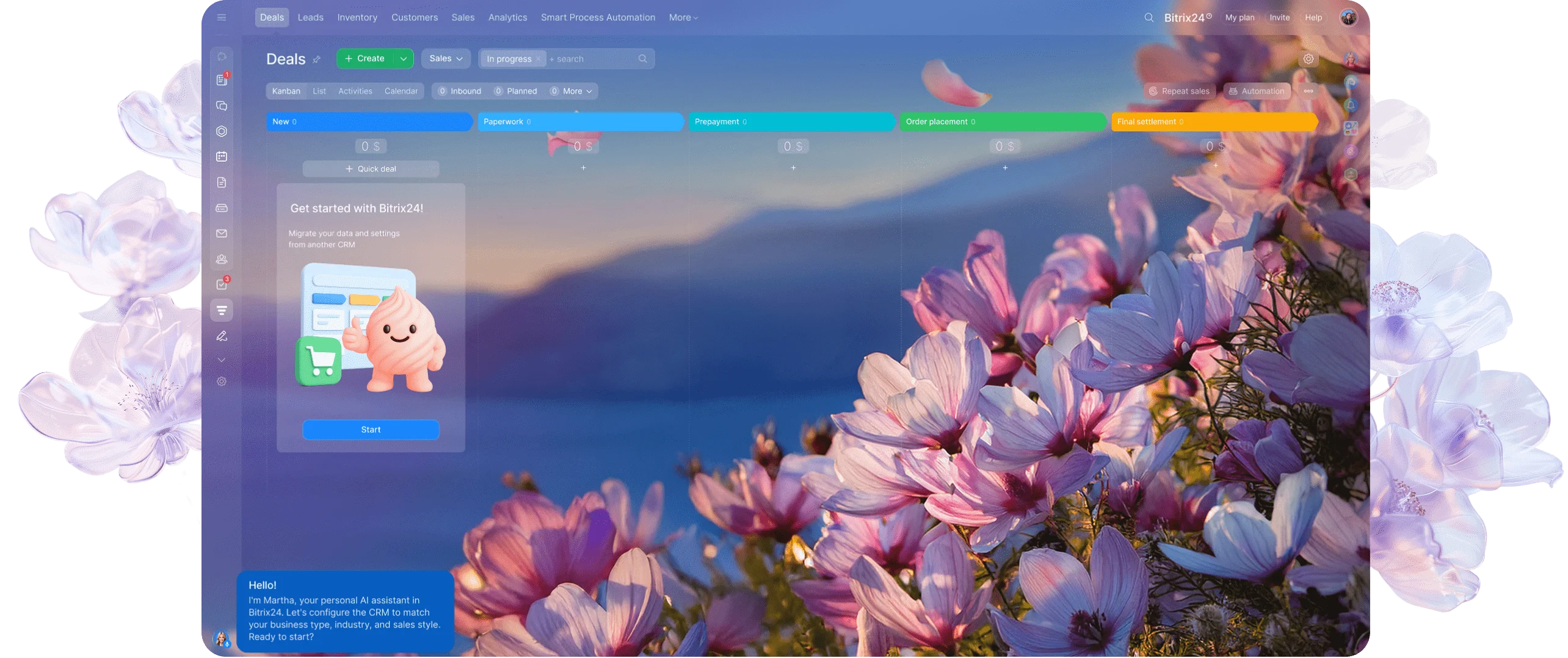 Martha es tu nueva aliada para dejar las cosas hechas. Desde la incorporación de productos hasta la programación diaria y la configuración de herramientas, este asistente basado en IA está aquí para aligerar tu carga de trabajo y ayudarte a ti y a tu equipo a navegar por Bitrix24 con facilidad.
