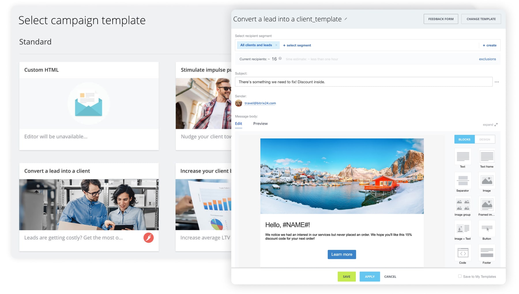 Llegue a prospectos y clientes actuales mediante una campaña de marketing por correo electrónico. Todo lo que necesita para completar este trabajo se incluye en sus herramientas de Bitrix24.