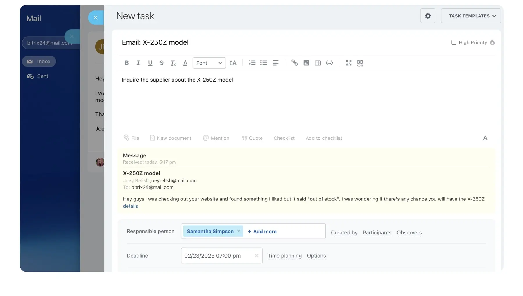 La productividad se utiliza tanto en tareas individuales como en proyectos. Los gerentes pueden asignar trabajo o tareas individuales, dividir proyectos más grandes en tareas más pequeñas o configurar un proyecto en Bitrix24 para que todos colaboren. La administración de tareas es más fácil cuando los gerentes pueden personalizar la forma en que se asignan. La posibilidad de convertir un correo electrónico en una tarea facilita el trabajo con las solicitudes de los clientes o las ideas del equipo para que nunca se olviden.