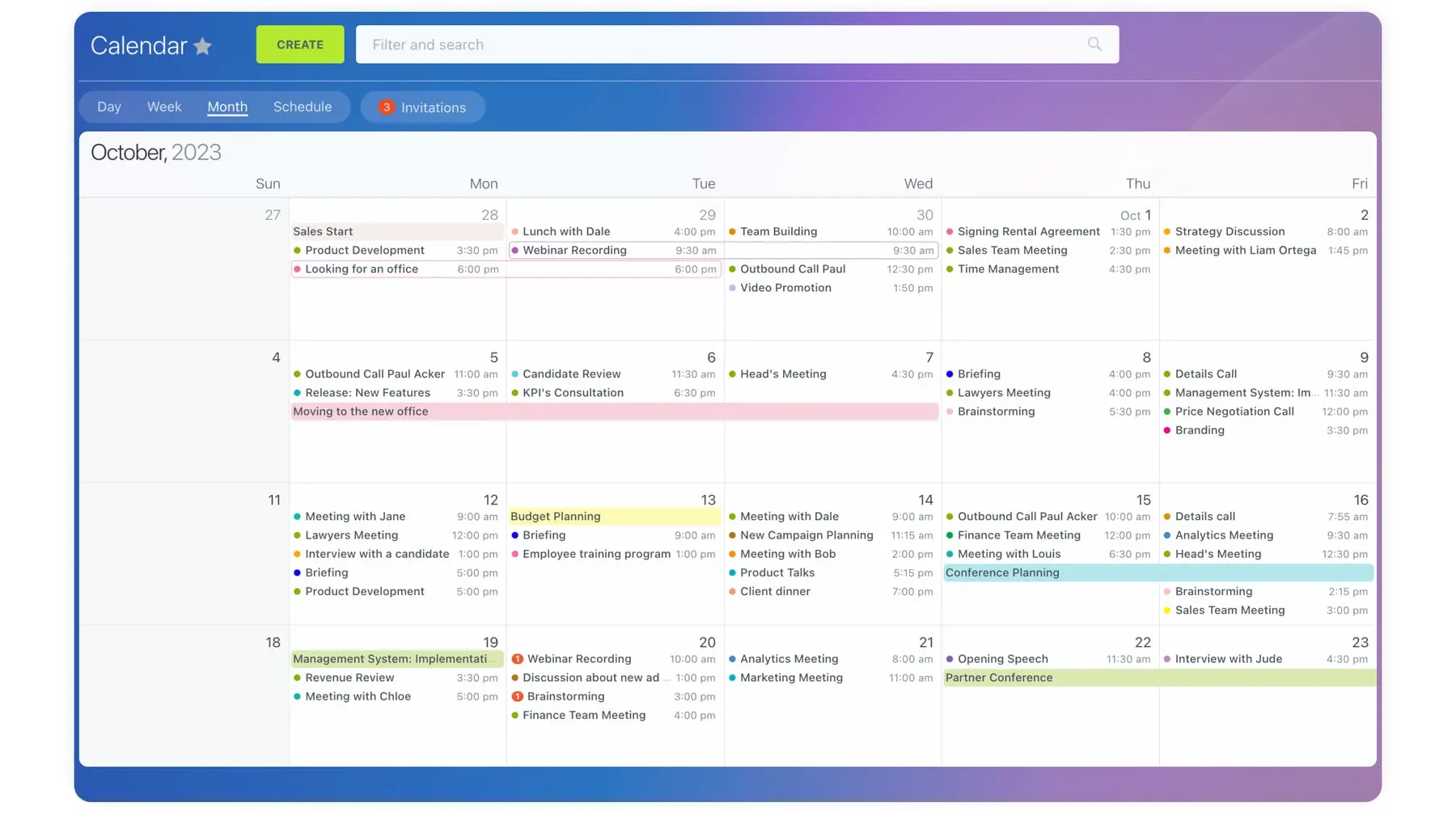 Mantén todos tus calendarios en un solo lugar. Con Bitrix24, puedes crear un calendario para administrar todas tus tareas personales. Utiliza los calendarios para administrar tus tareas y recordar siempre las fechas límite y los cronogramas. También puedes crear calendarios compartidos con la empresa o solamente con los equipos. La colaboración se vuelve más sencilla cuando los equipos pueden hacer un seguimiento de las tareas individuales, el progreso del proyecto grupal y chatear dentro del calendario. Los calendarios de Bitrix24 son aún más convenientes, porque podrás acceder a ellos desde cualquier lugar mediante la aplicación móvil. Ahora nadie volverá a faltar a una reunión.