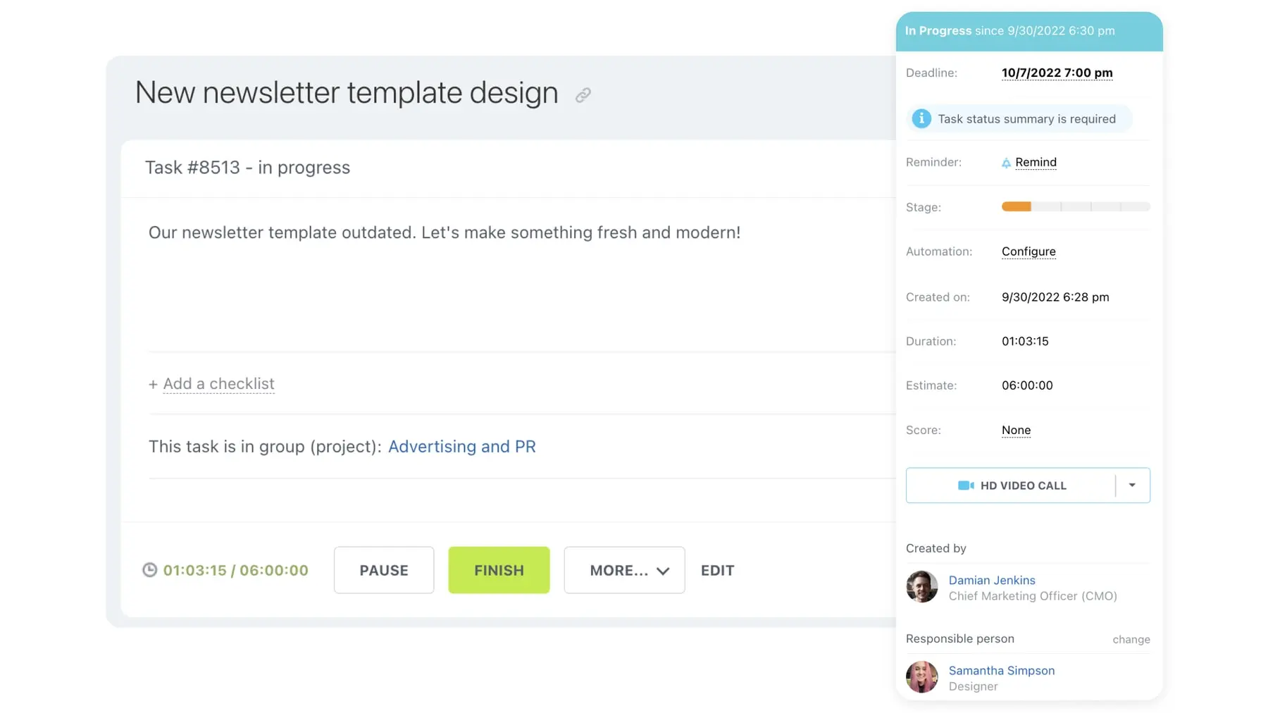 Para quienes asignan tareas, la herramienta de software para la administración de oficinas facilita todo. En el caso de las tareas que se repiten, usa la configuración automatizada para establecer tareas diarias, semanales, mensuales o personalizadas. Comunícate en las tareas para llevar un registro del progreso o utiliza el chat para discutir las cargas de trabajo. Los jefes del proyecto pueden ver la carga de trabajo de los miembros del equipo y asignar o quitar tareas según sea necesario.
