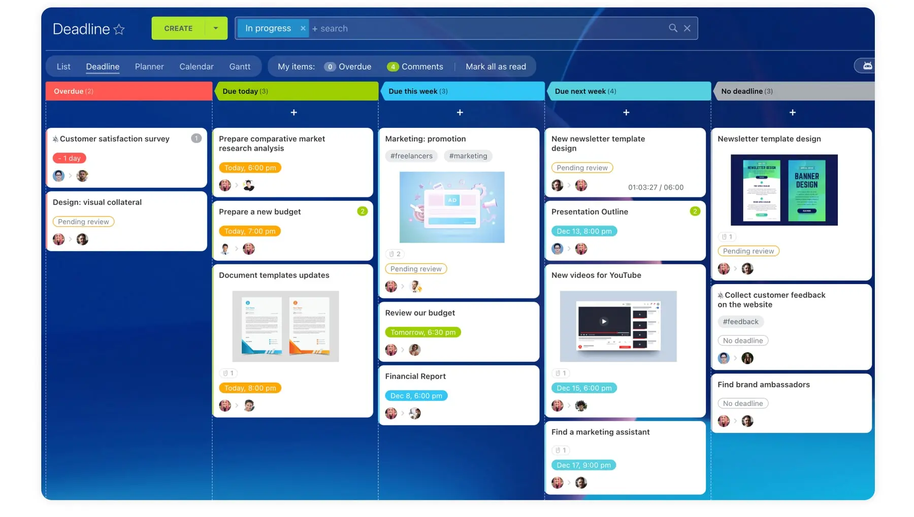Los diagramas de Gantt son otra valiosa herramienta para quienes prefieren administrar las tareas de manera visual. Estos diagramas ayudan a visualizar y organizar las tareas y recursos en un solo lugar. Los equipos pueden trabajar juntos en la plataforma colaborativa en línea para alcanzar las metas y chatear para completar los trabajos. Los diagramas dinámicos son solo una forma de un mejor trabajo en equipo.