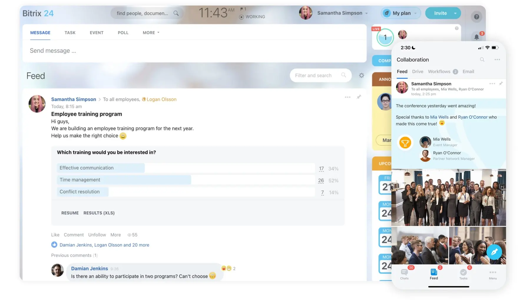 Uno de los mayores beneficios de usar Bitrix24 es que ayuda a los equipos a trabajar mejor juntos. Cuenta con muchos espacios para que los equipos se comuniquen y colaboren mediante una plataforma única. Algunos de los espacios más populares para comunicarse son los chats, los espacios para chatear en las plantillas de las tareas y en los calendarios. Con la comunicación en tiempo real disponible, los equipos pueden colaborar más fácilmente. Bitrix24 también permite que los gerentes guarden las comunicaciones en un lugar centralizado para facilitar el acceso posterior. De esta manera, todos podrán encontrar las decisiones rápidamente después de las reuniones del equipo o de las comunicaciones originales con los clientes.