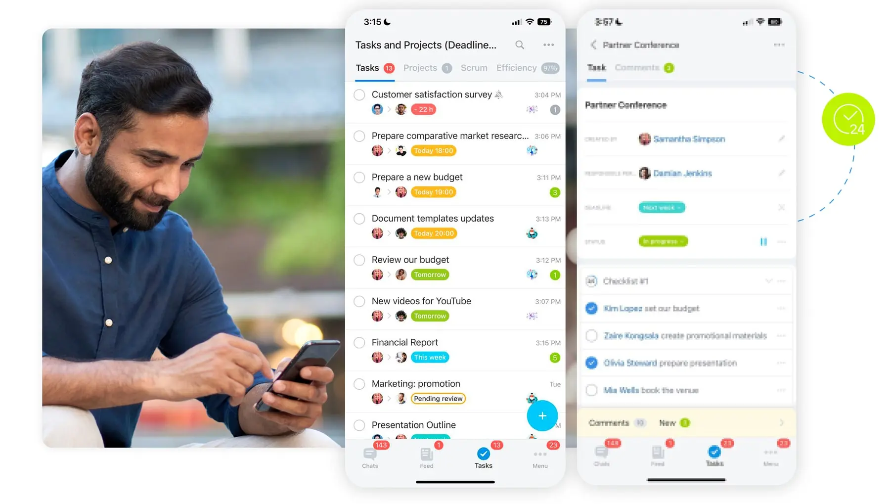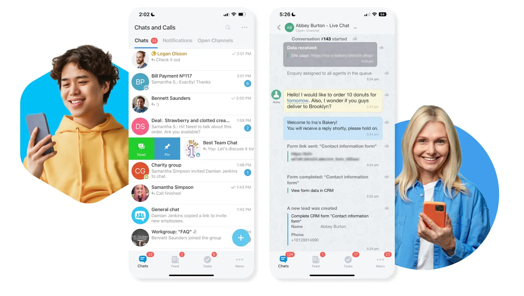 Ahora puedes llevar Bitrix24 contigo a cualquier lugar. Nuestra aplicación móvil está diseñada para permitir que el usuario administre el trabajo y las tareas desde su smartphone. Esto también se aplica al servicio al cliente. Si un cliente se pone en contacto contigo, tendrás la opción de responderle rápidamente, incluso si no estás en la oficina. La flexibilidad es esencial para proporcionar un excelente servicio al cliente.