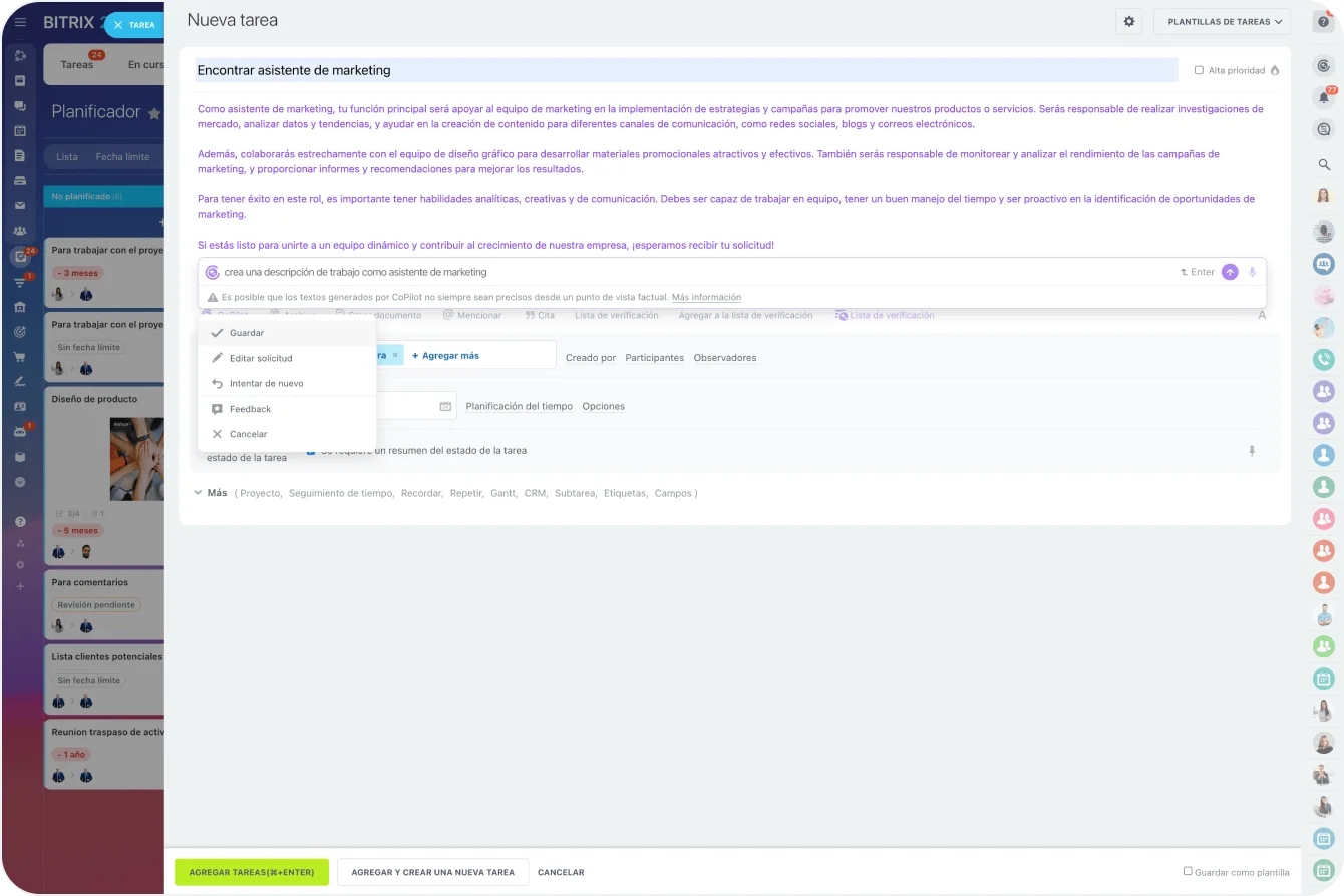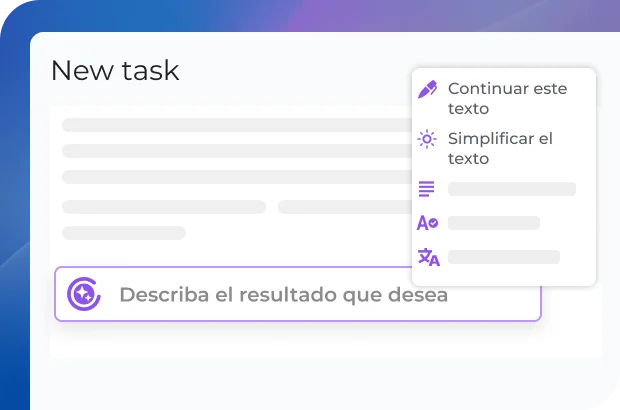 Tu asistente personal de IA siempre está listo para ayudarte cuando planificas un proyecto o creas una nueva tarea. CoPilot puede generar fácilmente una descripción de tarea breve y comprensible basada en tu indicación e incluso ofrecer una lista de verificación adecuada para la tarea.