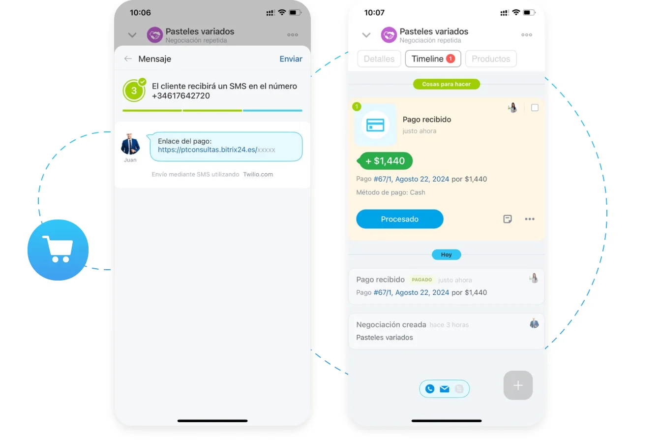 Puedes solicitar y recibir pagos de tus clientes desde la aplicación móvil de Bitrix24 CRM.