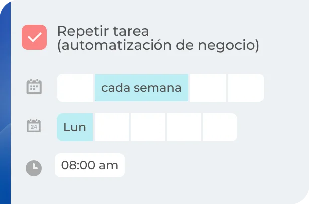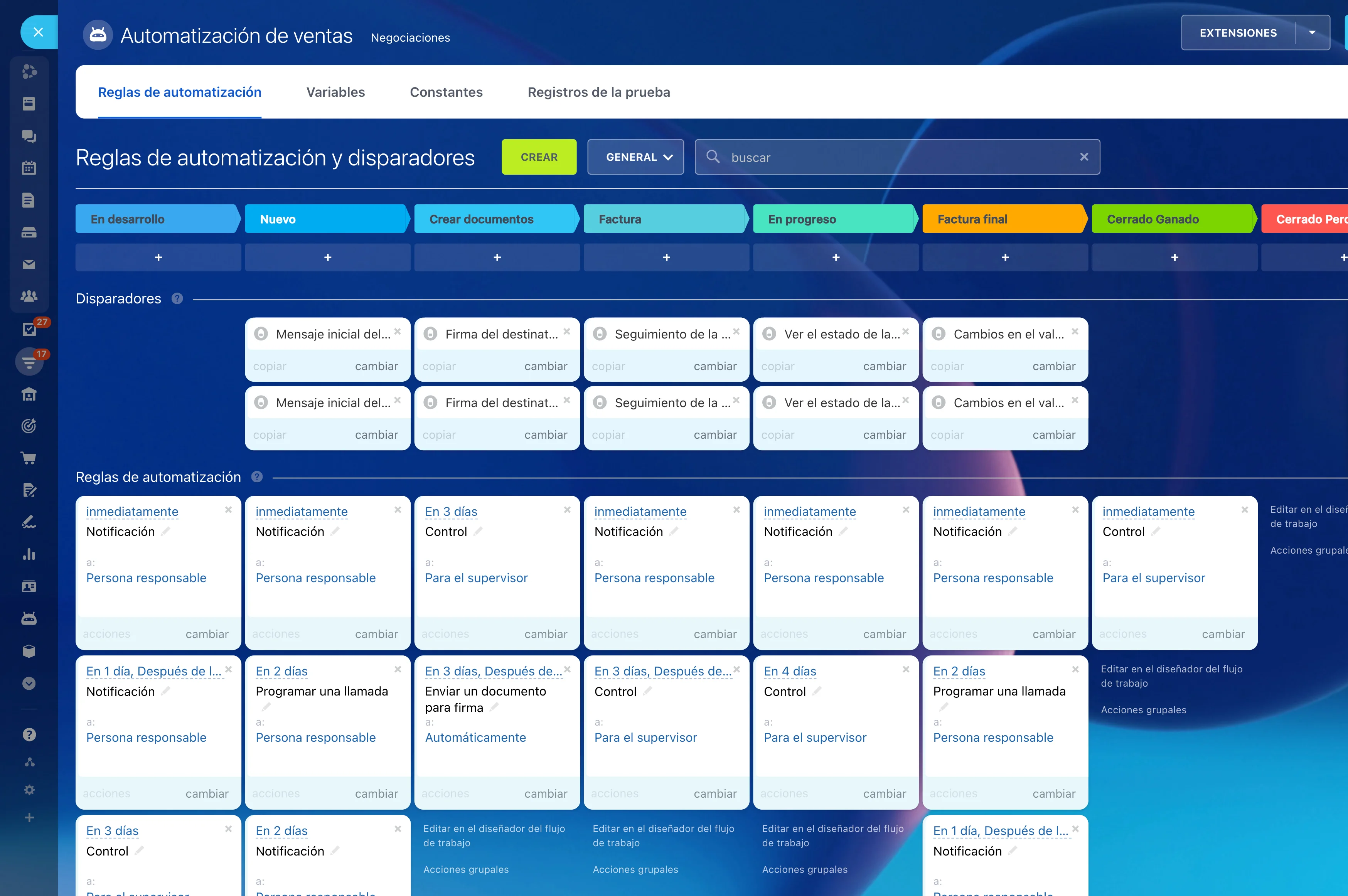 Las tareas pueden crearse automáticamente con base en ciertos disparadores y acciones en el CRM (p. ej.: cuando una negociación se mueve a la siguiente etapa, se crea una tarea nueva para que un empleado envíe por correo electrónico una factura al cliente).