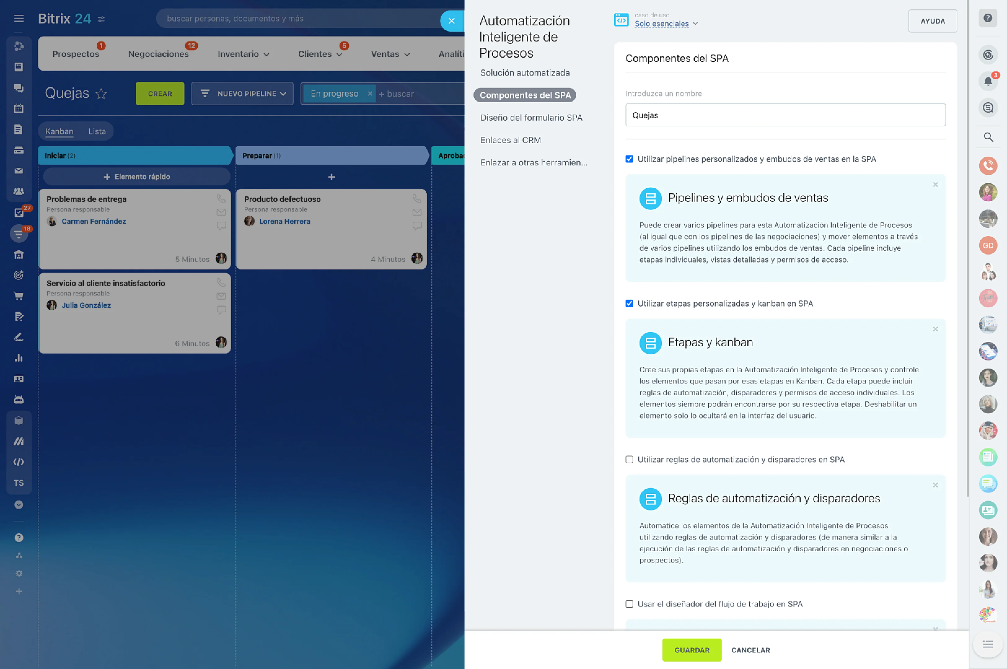 Un proceso inteligente en Bitrix24 es un tipo de elemento personalizable en el CRM que te permite crear tus propios escenarios de trabajo. Ve más allá de las negociaciones, prospectos y cotizaciones: crea y automatiza tus propias entidades (listas de contratistas, embudos de ventas, registro de documentos, etc.).
