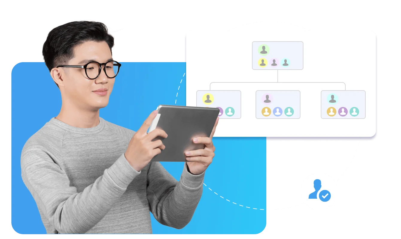 El gráfico de estructura de la empresa es una gran representación visual de la jerarquía de tu equipo. Como administrador, puedes ver fácilmente quién pertenece a cada departamento y administrar sus permisos de acceso.