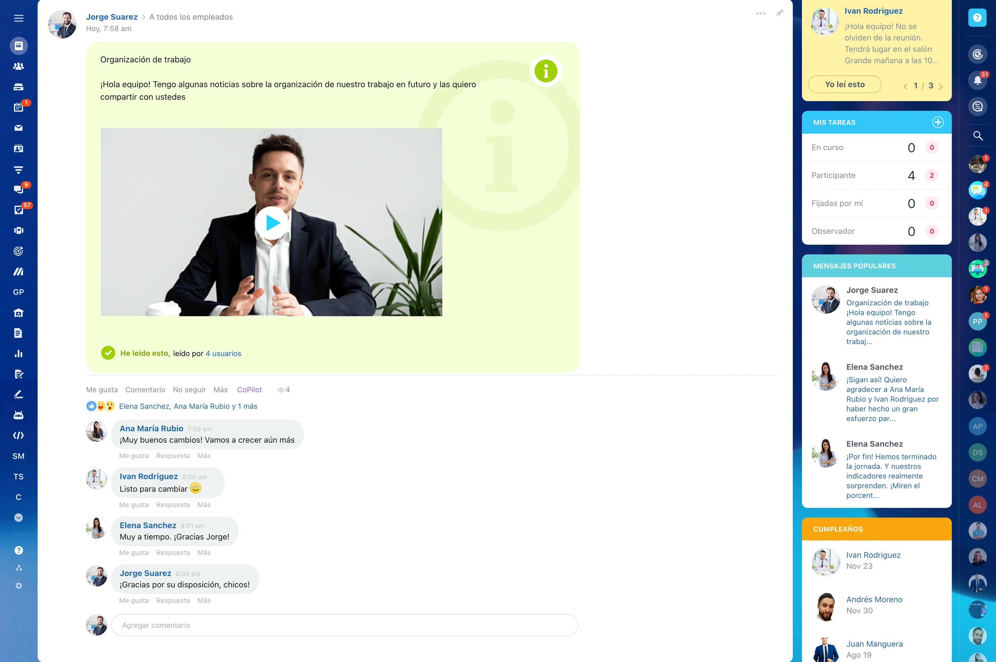 El feed del software de anuncios de Bitrix24 es el lugar donde puedes leer las noticias de la empresa y el equipo, ver anuncios, participar en encuestas y conversar en los comentarios o compartir una publicación propia con los miembros de equipo seleccionados o toda la empresa.