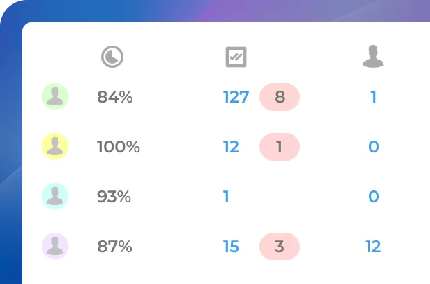 Las tareas asignadas a una persona se monitorean para medir cuántas fueron completadas a tiempo y sin objeciones. Puedes ver la eficiencia de la tarea por empleados y departamentos.